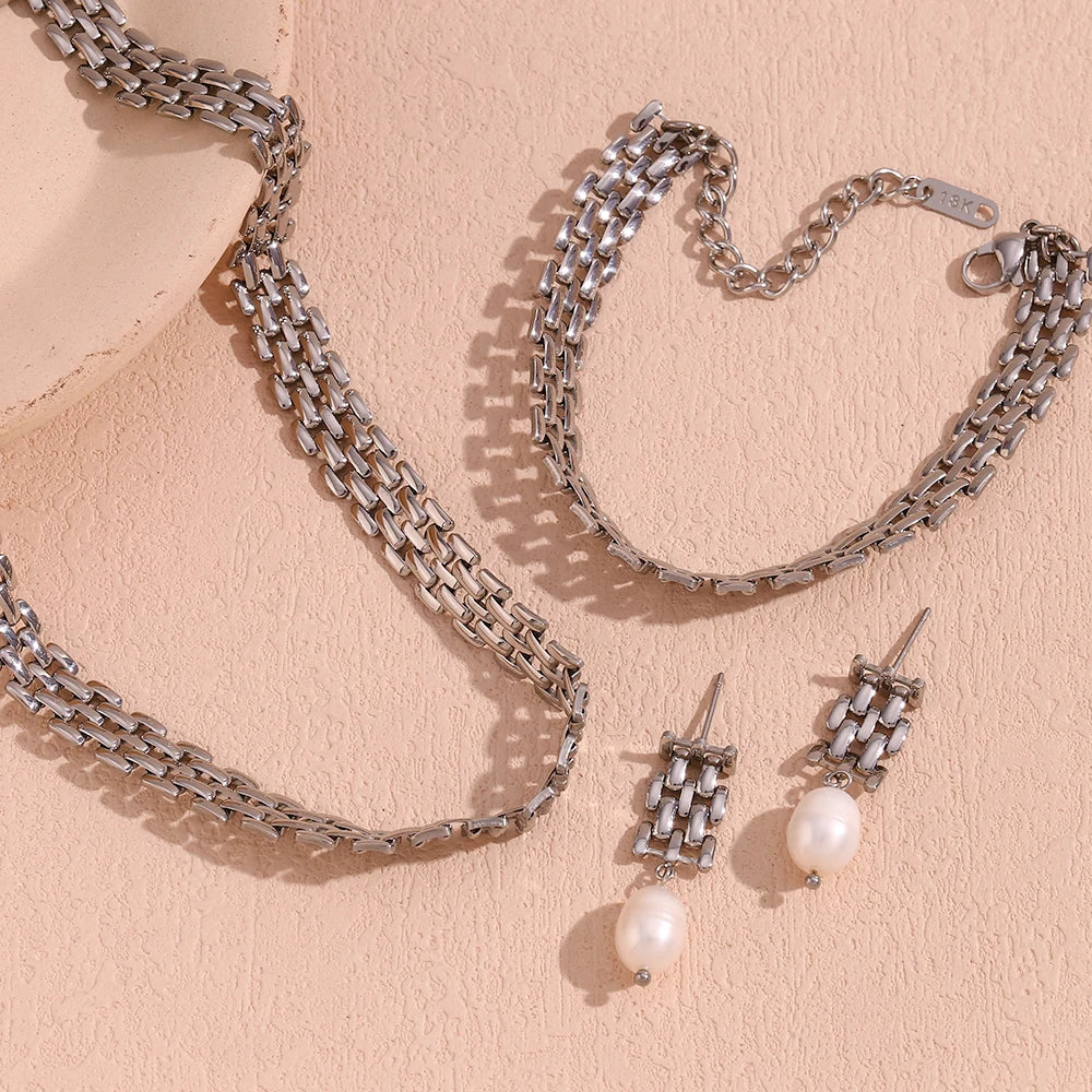 Embrace timeless beauty with the Lumina Set. This captivating collection features a unique blend of sleek, watch strap chain designs and luminous pearls, crafted from high-quality, 18k gold plated stainless steel.