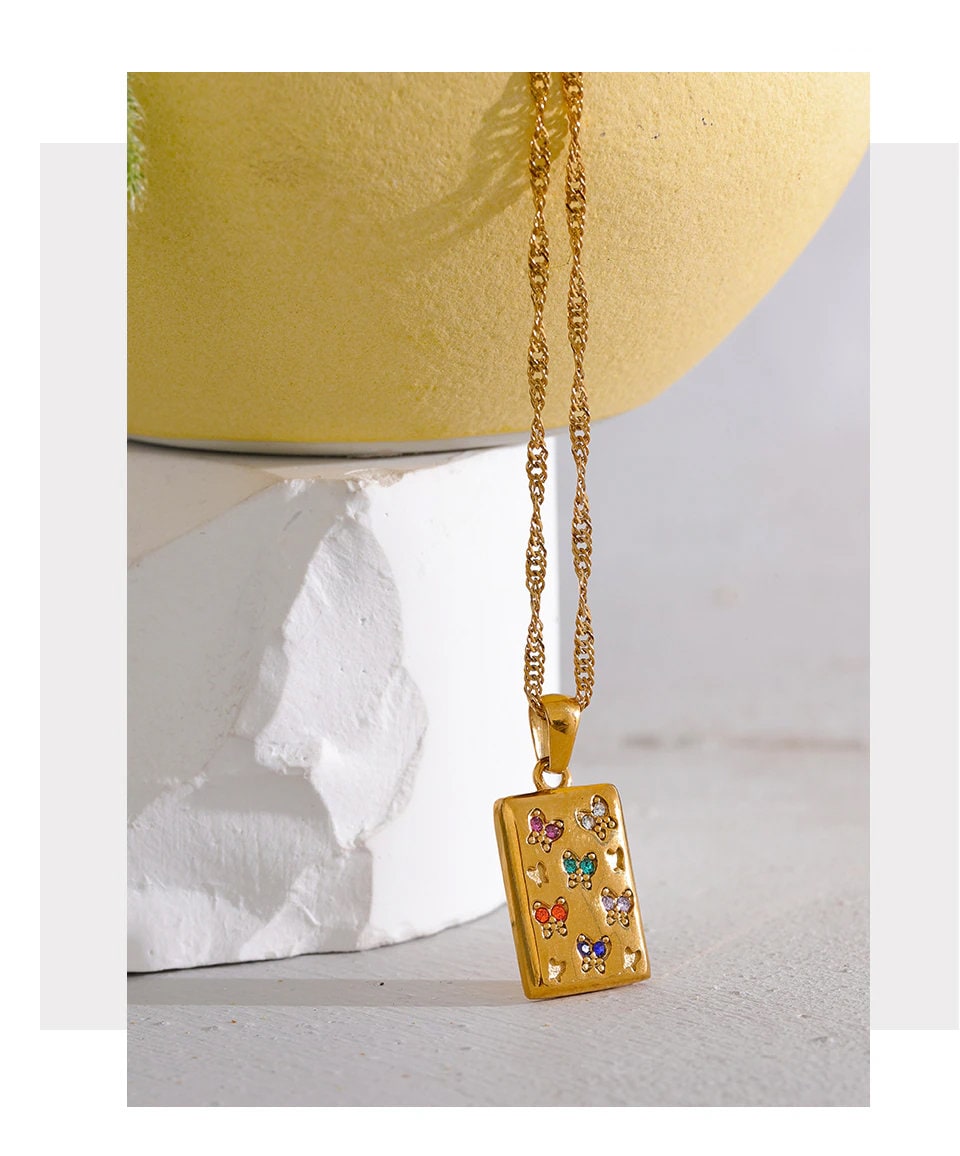 What sets this necklace apart is the use of colorful Cubic Zirconia (CZ) gemstones. The butterfly's are adorned with a vibrant array of CZs in various colors, including brilliant blues, radiant greens, dazzling pinks, and captivating red. The use of these colorful gemstones adds a touch of whimsy and liveliness to the necklace, making it a true statement piece.