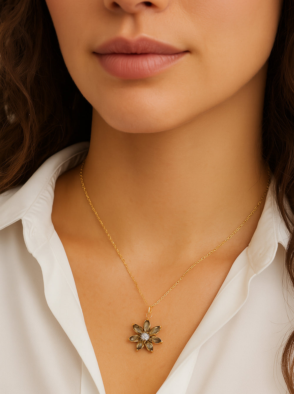 A stunning flower-shaped pendant crafted with marquise-cut gemstones and a sparkling center stone, set in radiant gold. This nature-inspired necklace is equal parts elegant and timeless—perfect for everyday wear or special occasions. Available in vibrant emerald green, classic smoky quartz tones, Clear Crystal, Purple & a Light Lavender.