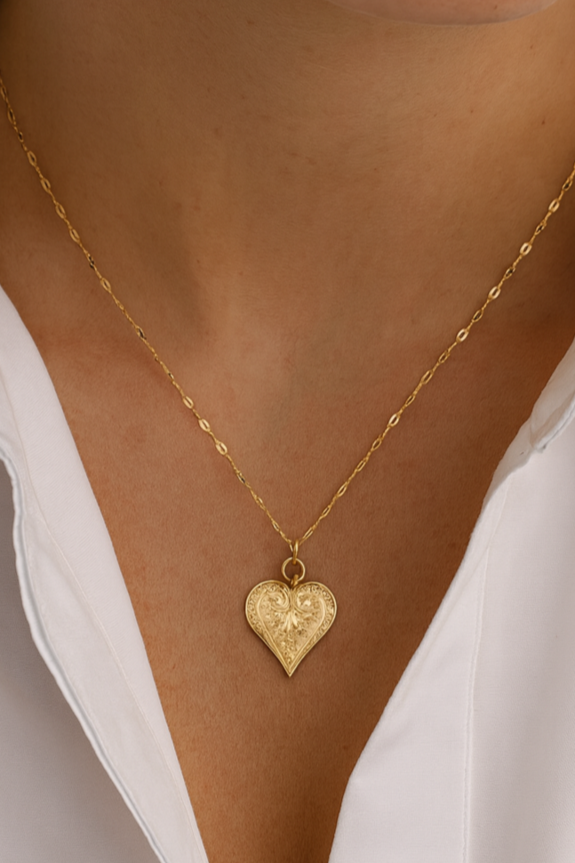 - Pendant: Ornate heart design with engraved filigree-style detail