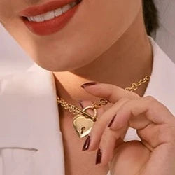 Experience the charm of the Charlotte Necklace, featuring a romantic heart lock pendant, elegantly crafted from stainless steel and plated with luxurious 18k gold. The sophisticated T-clasp closure and 45 cm length create a perfect choker style, adding a touch of modern elegance to any outfit. Lightweight and hypoallergenic, the Charlotte Necklace is designed for both style and comfort.