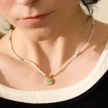 Celebrate sophisticated elegance with the Sophia Necklace, featuring a striking square pendant with embedded amazonite, gracefully plated in 18k gold over stainless steel. The necklace showcases a chain adorned with exquisite crystal beads, adding a touch of chic glamour to any ensemble. With its carefully handcrafted design, the Elara Necklace embodies a perfect blend of luxury and style.