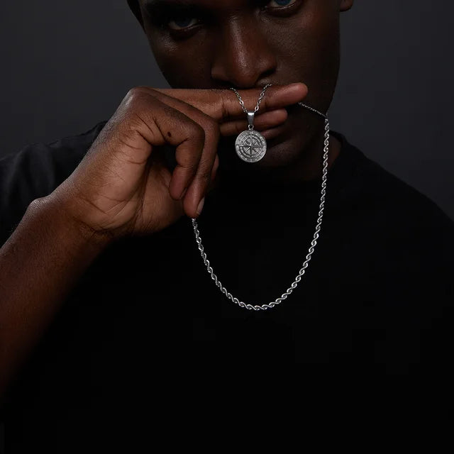 Meticulously crafted from hypoallergenic and nickel-free stainless steel, the Voyager's Compass features a striking rope chain, creating a bold and textured look. The compass pendant, a nod to the thrill of navigation and travel, adds an intriguing focal point to this layered masterpiece.