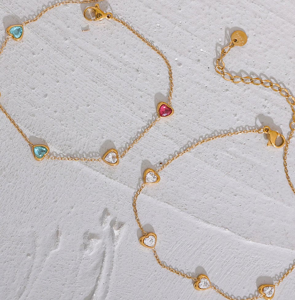The Adora Heart Anklet is meticulously crafted to blend timeless elegance with a modern twist. Each heart-shaped cubic zirconia gemstone is expertly cut to sparkle brilliantly, captivating light and creating an enchanting aura. The delicate chain gracefully encircles your ankle, offering an allure that is both refined and radiant. This anklet is not just a piece of jewelry, but a sparkling statement of style.