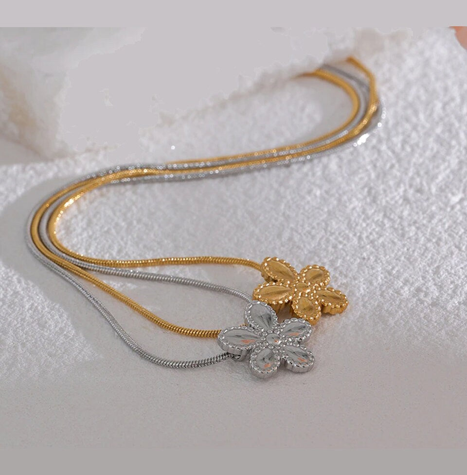 Introducing our dainty flower pendant necklace, available in both stainless steel silver and 18K PVD gold. This charming piece captures the essence of nature's beauty with its delicate flower pendant. Crafted with meticulous attention to detail, the pendant showcases intricate petal designs, exuding a sense of elegance and grace. Choose between the sleek and timeless stainless steel silver option or the luxurious allure of 18K PVD gold to suit your personal style. The necklace is designed to be lightweight and comfortable, making it perfect for everyday wear. With an adjustable chain, it ensures a perfect fit for any neckline. Embrace the beauty of nature and enhance your style with this dainty flower pendant necklace, a symbol of both femininity and blooming elegance.